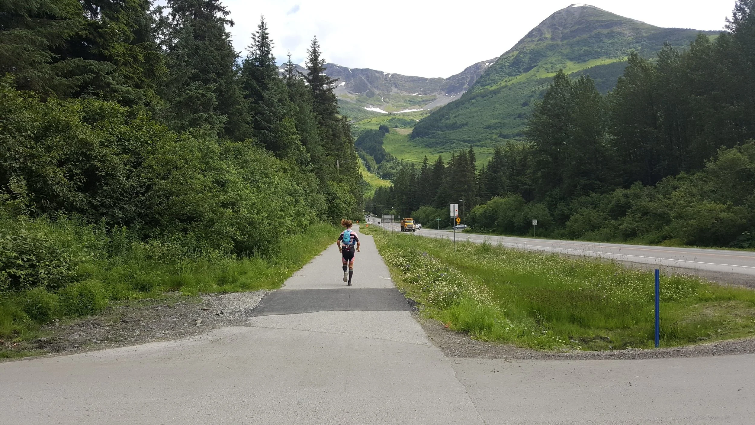 This was a wonderful part of the day. Even though I crunched my calve a bit more on the steep, short hills, making the pain sharp and relentless, I picked up my pace, passed a couple of women, and with Eric at my side my spirits soared. When we finished our loop at the base of Mt. Alyeska, Eric passed the baton to Sarah and we quickly took off to bulldoze the last seven miles on the mountain.