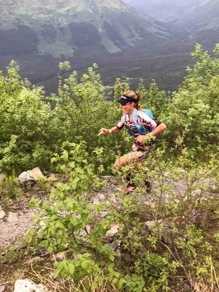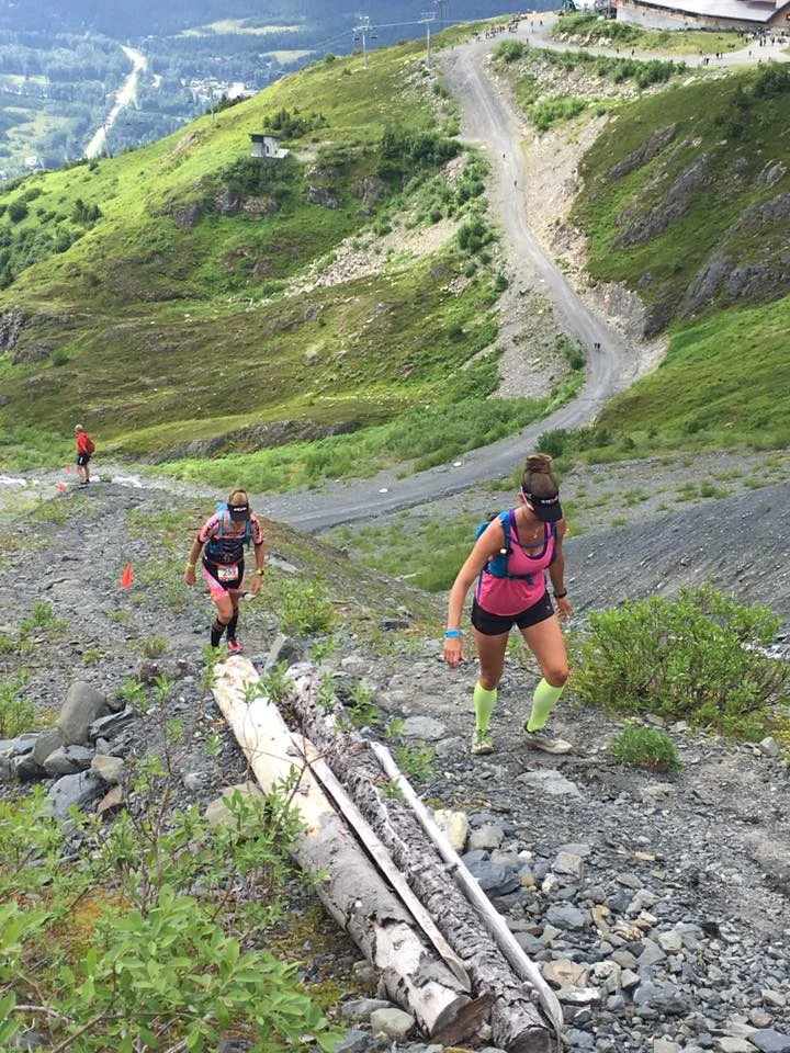 Sarah and I were both in great moods laughing and trucking up the climbs of the first ascent high-fiving each other and the outstanding volunteers who cheered us on along the way. When we made it to the top, I truly felt like I was on top of the world. The scenery was breath-taking. It reminded me that the reason I signed up for this race over a year ago was for an excuse to explore Alaska. Something pulled at this California girl to go seek adventure in Alaska, and suddenly there I was standing on top of one of its most majestic peaks staring and smiling at the amazing view. All I had left was to run down to the bottom, and then hike back up it to the finish line.