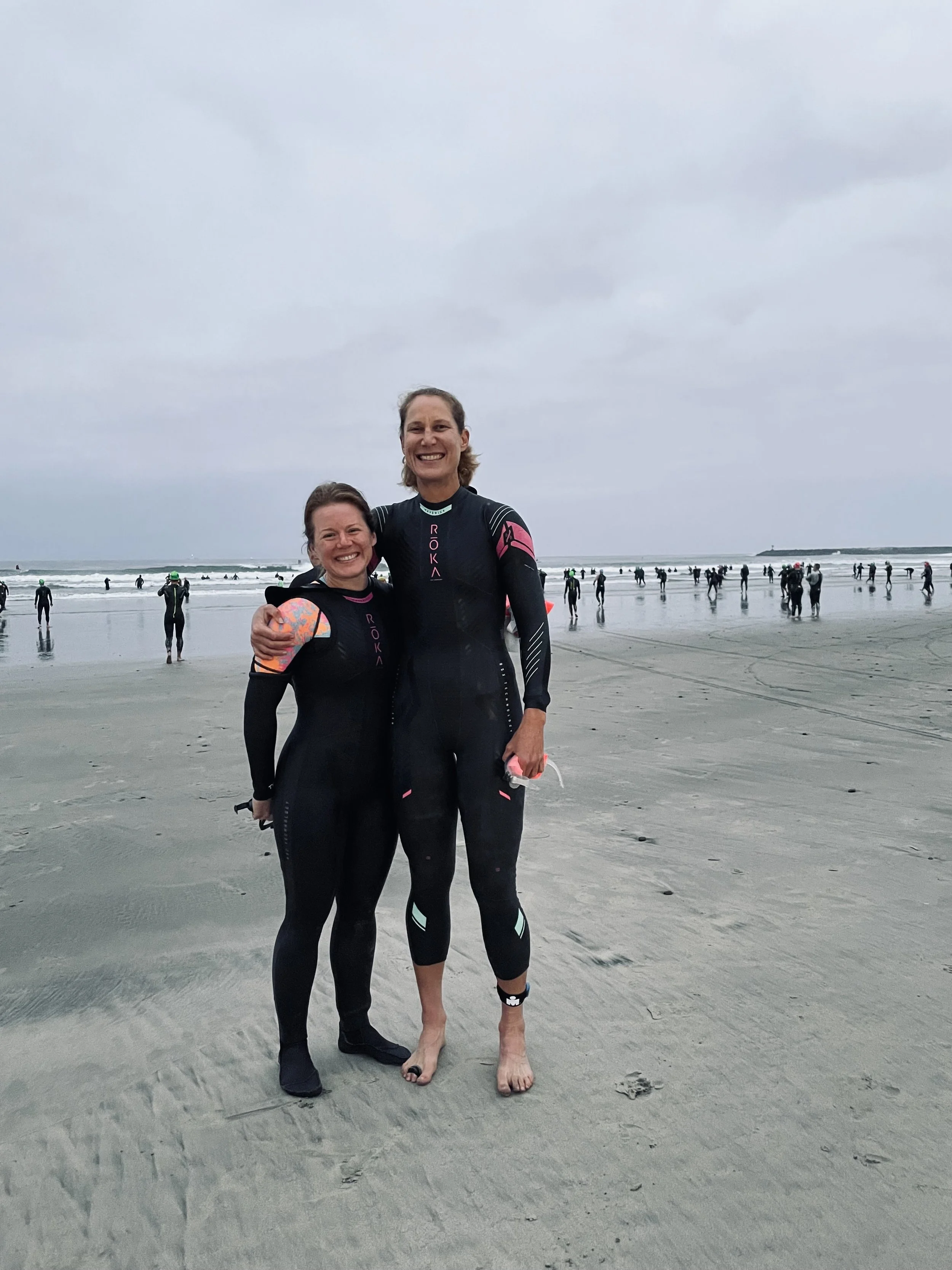 Just before hopping in the Pacific on race morning with my friend and teammate Jen Sykes. Photo credit: Jen's wonderful BF, Joe.