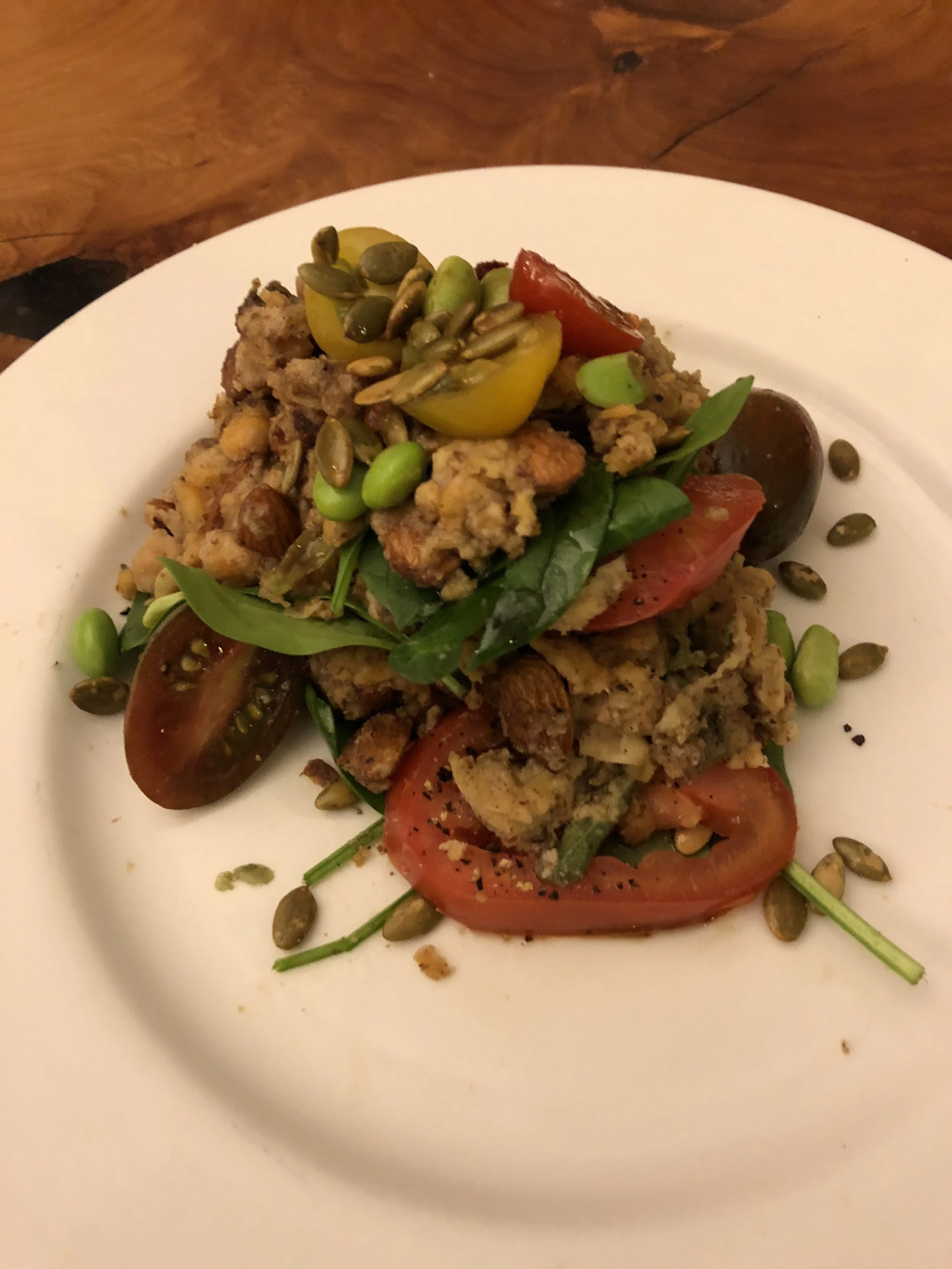 Design on a plate with sliced Roma tomatoes, fresh spinach, and Pepitas.